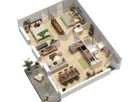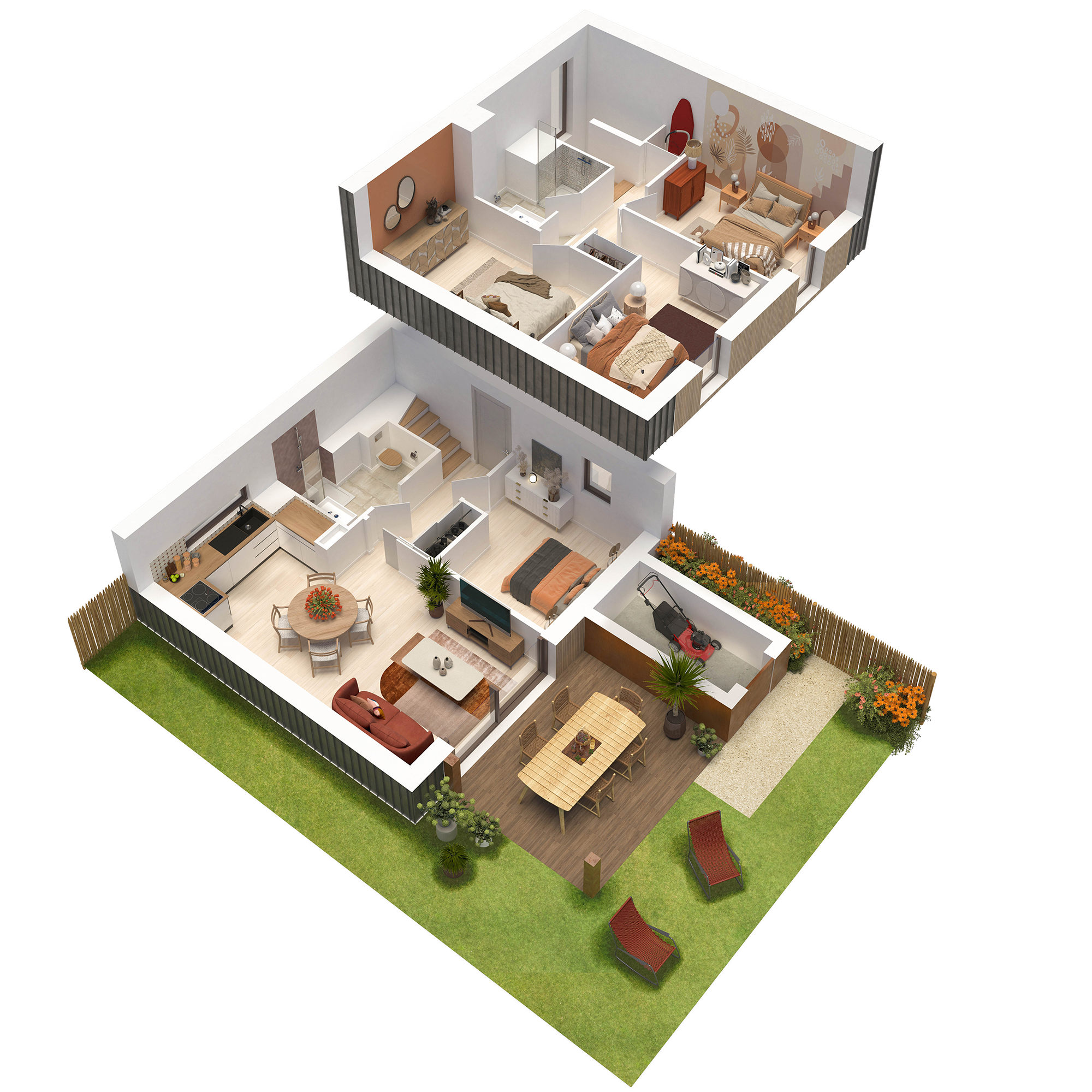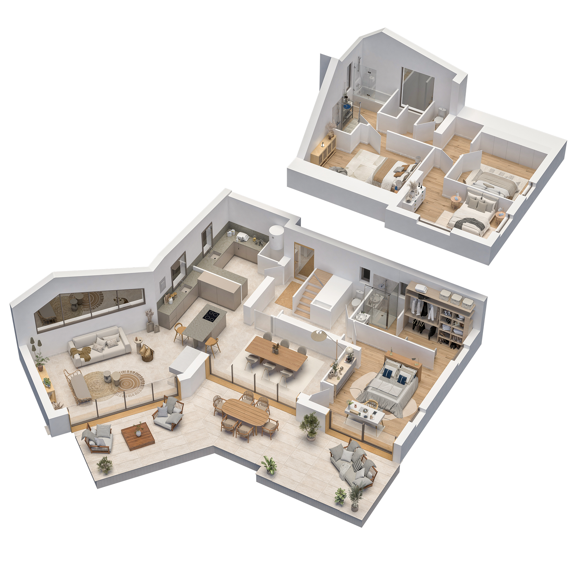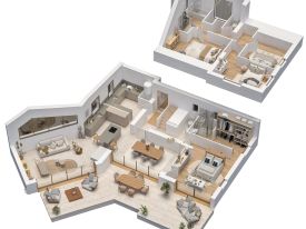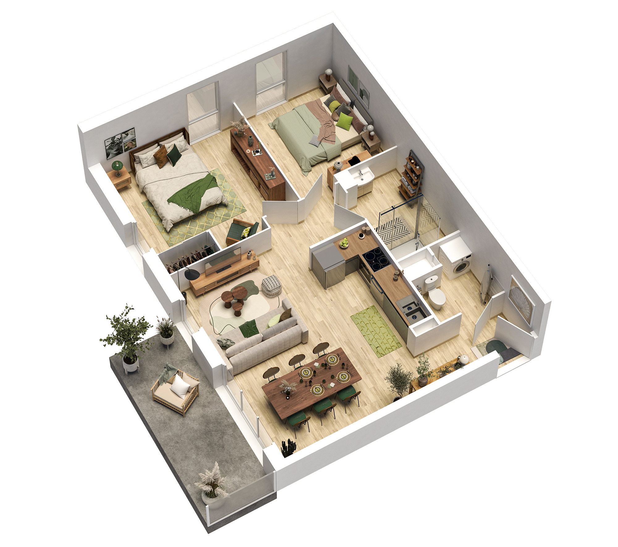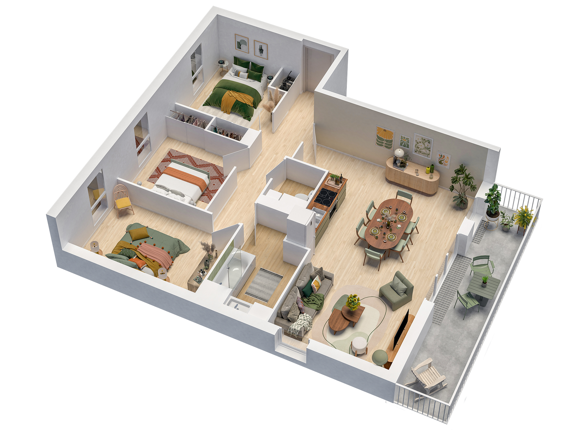 Le plan de vente 3D permet une visualisation globale des espaces et de l'aménagement des biens proposés à la vente. Fidèle aux volumes et à l'agencement c'est un atout pour la mise en commercialisation de vos programmes auprès des particuliers.